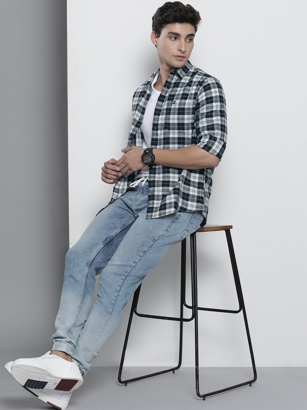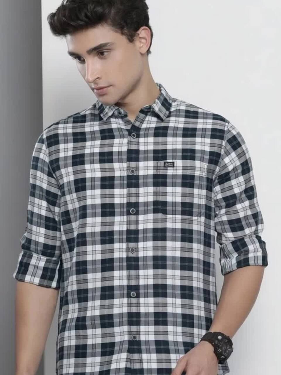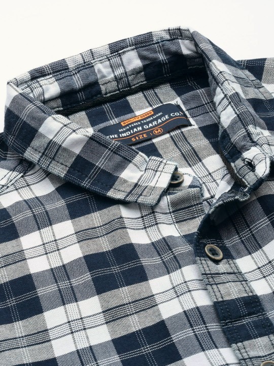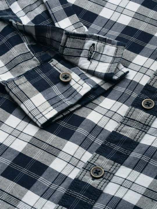 Navy blue and off-white checked opaque Casual shirt ,has a spread collar, button placket, 1 patch pocket, long regular sleeves, curved hem